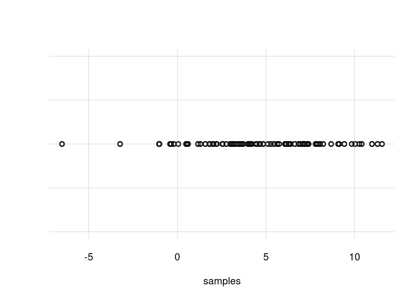 samples <- rnorm(n = 100, mean = 5, sd = 3)Then we need to display these points in a graph.