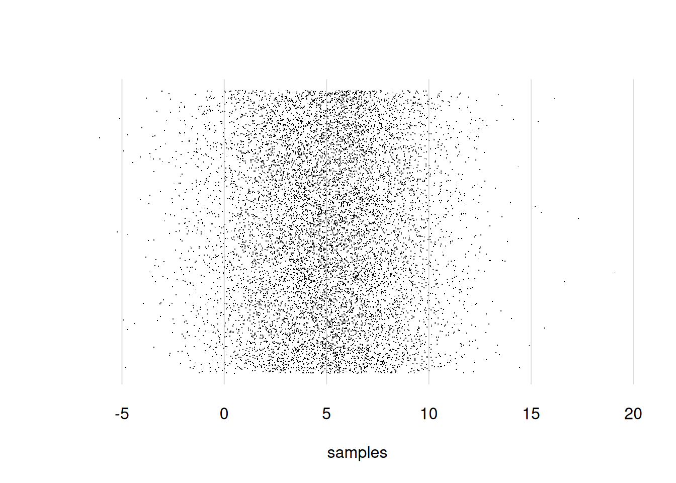 Still another alternative is to generate many sample points and represent them as a cloud of dots, which also extends in the y-direction. This is done by using the arguments pch = '.' and yjitter = TRUE. Let’s first generate 10 000 sample points and then plot them this way: