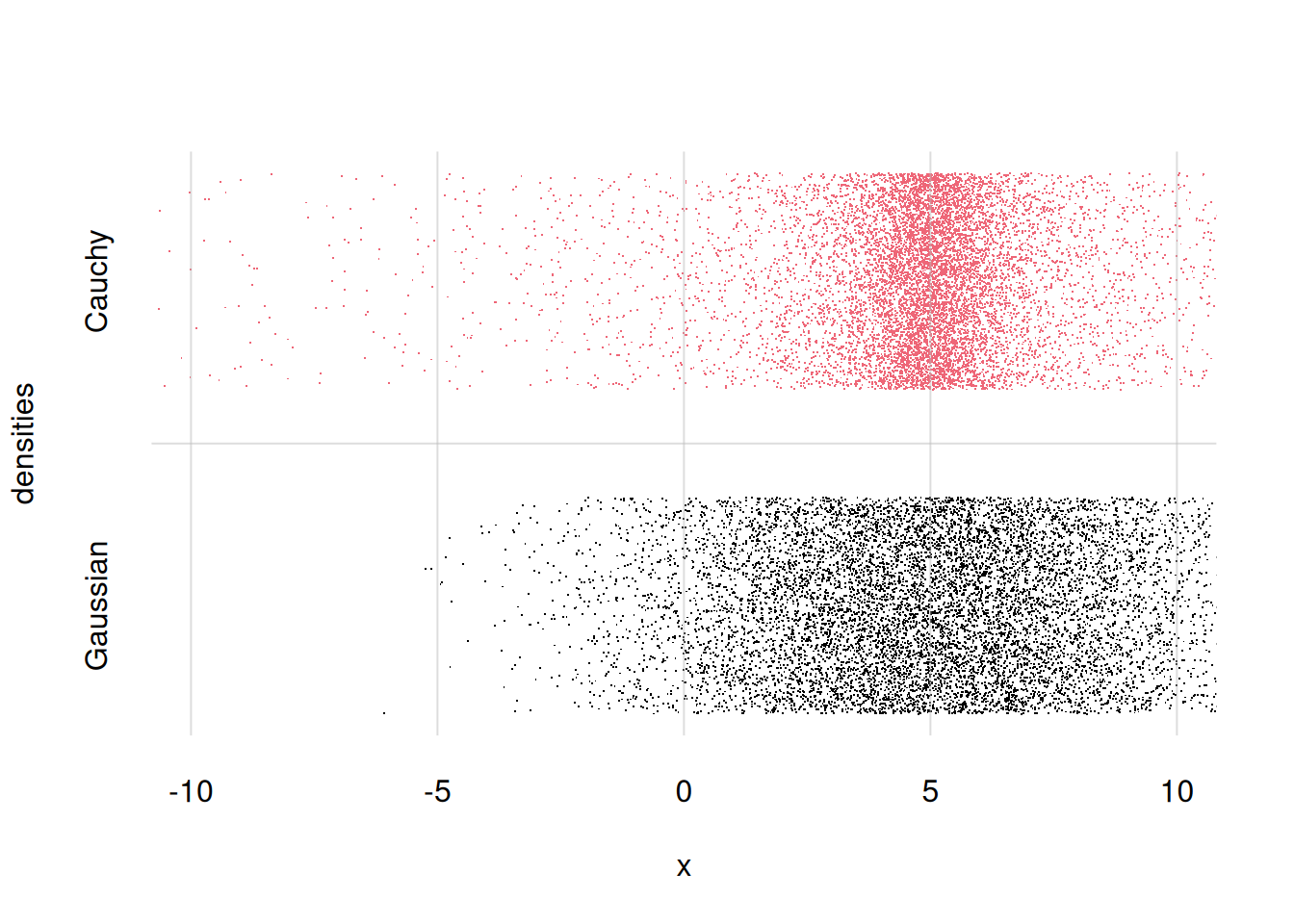 Finally, let’s suppose we want two visualize and compare two different probability densities for \(X\): the Gaussian distribution from before, and a Cauchy distribution. We can do this by generating sample points for both, and then plot them together with flexiplot() as discussed above.