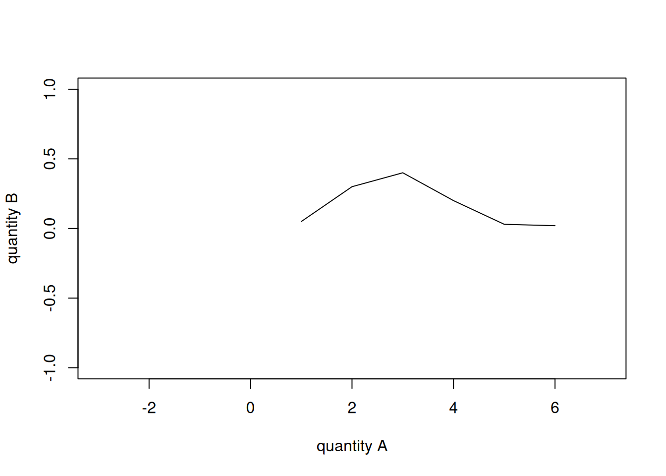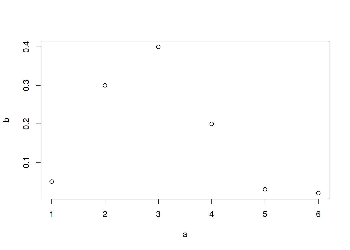 A very simple kind of plot is the one where we plot a sequence of values against another sequence of the same length, interpreting the first as x-axis and the second as y-axis. This can be done with the base R function plot(). Here we consider sequences a and b, with six values each: