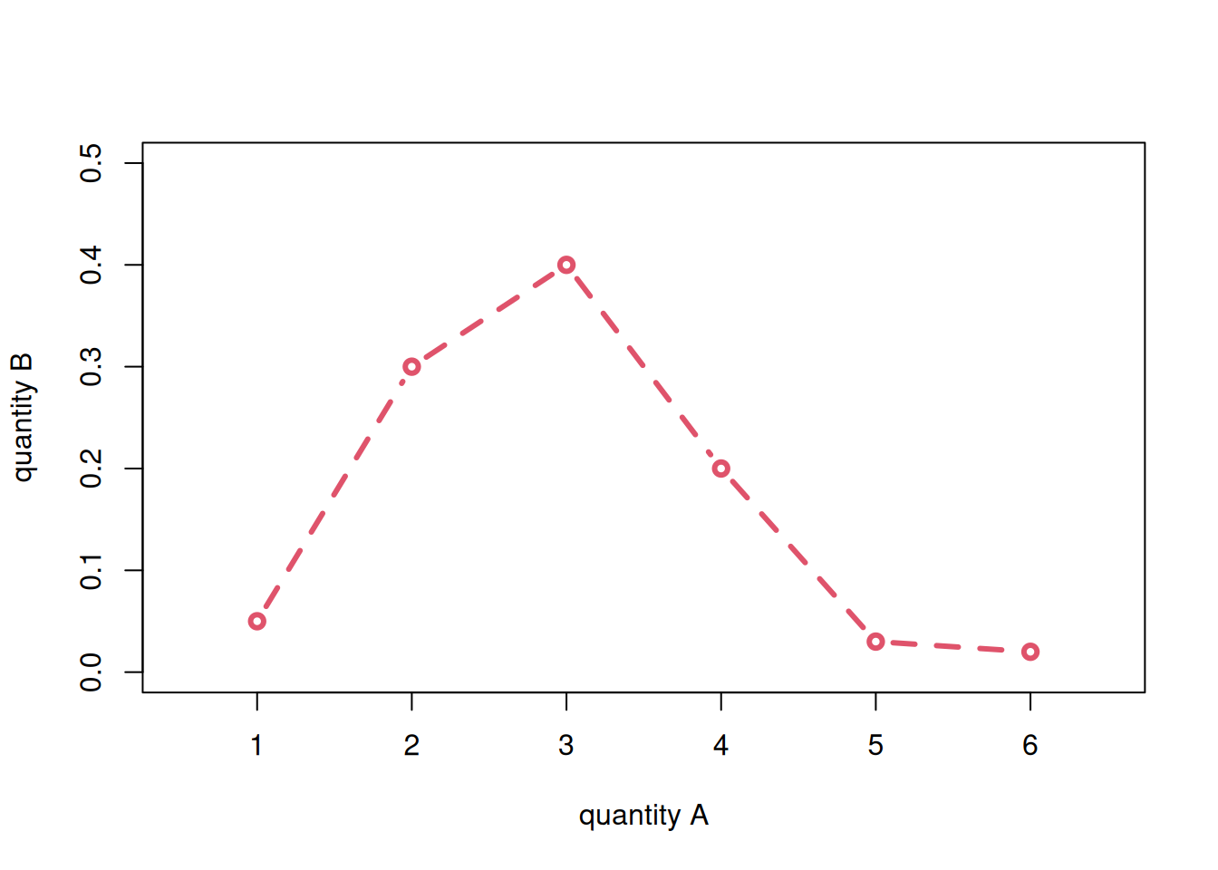 You notice that the names of the variables appear automatically on the axes, and the pairs of points are represented by small, empty circles. If we want to join the points with lines we can use the type = 'l' argument; with type = 'b' we get both circles and lines. The line width is controlled by the lwd = argument, and the line type (solid, dashed, dotted, and so on) by the lty = argument. The colour by col =. We can also change the axes’ labels with xlab = and ylab =, and the ranges of the two axes with xlim = and ylim =. Let’s see two examples:
