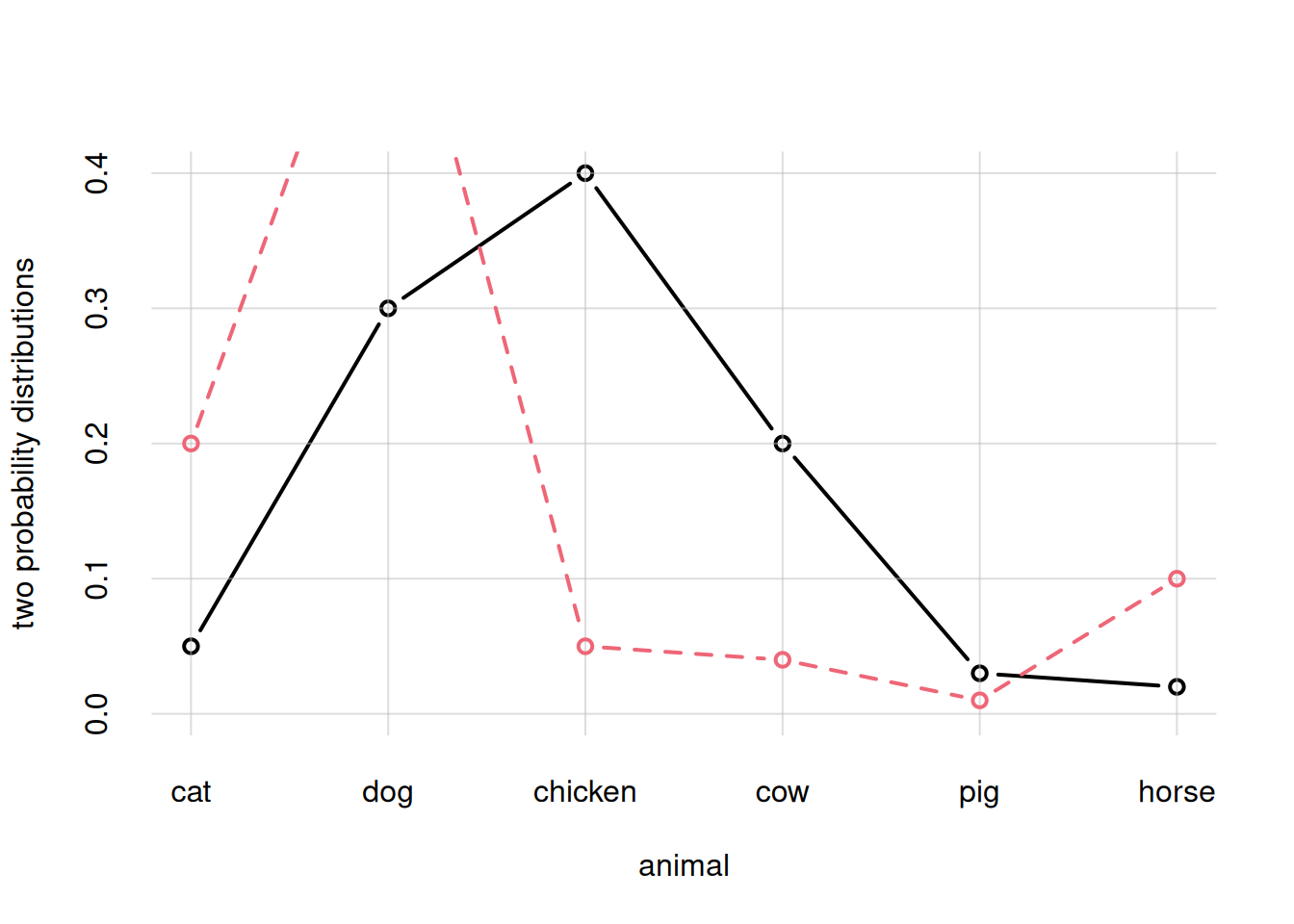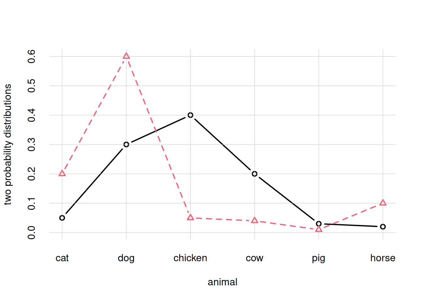 source('tplotfunctions.R')Consider a quantity animal that could be one of six possible animals, and the distribution of probability over them, assigned to a variable prob. With flexiplot() we can plot the probability distribution as follows: