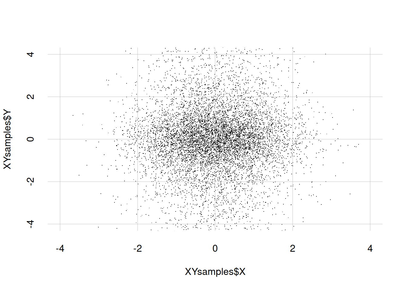 XYsamples <- data.frame(X = rnorm(n = 10000), Y = rcauchy(n = 10000))